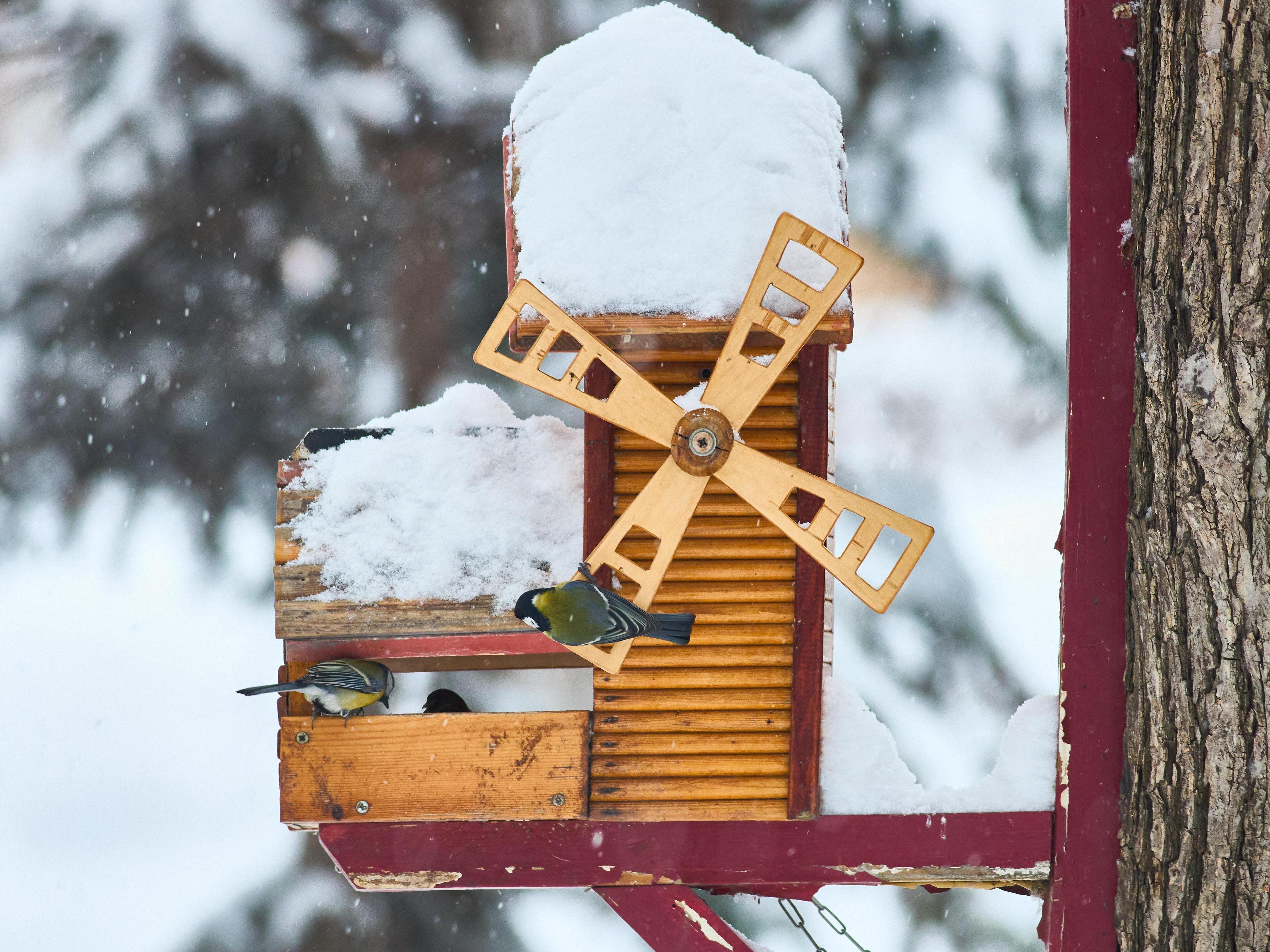 Small birds sit unperturbed on a branch as snow falls around them.