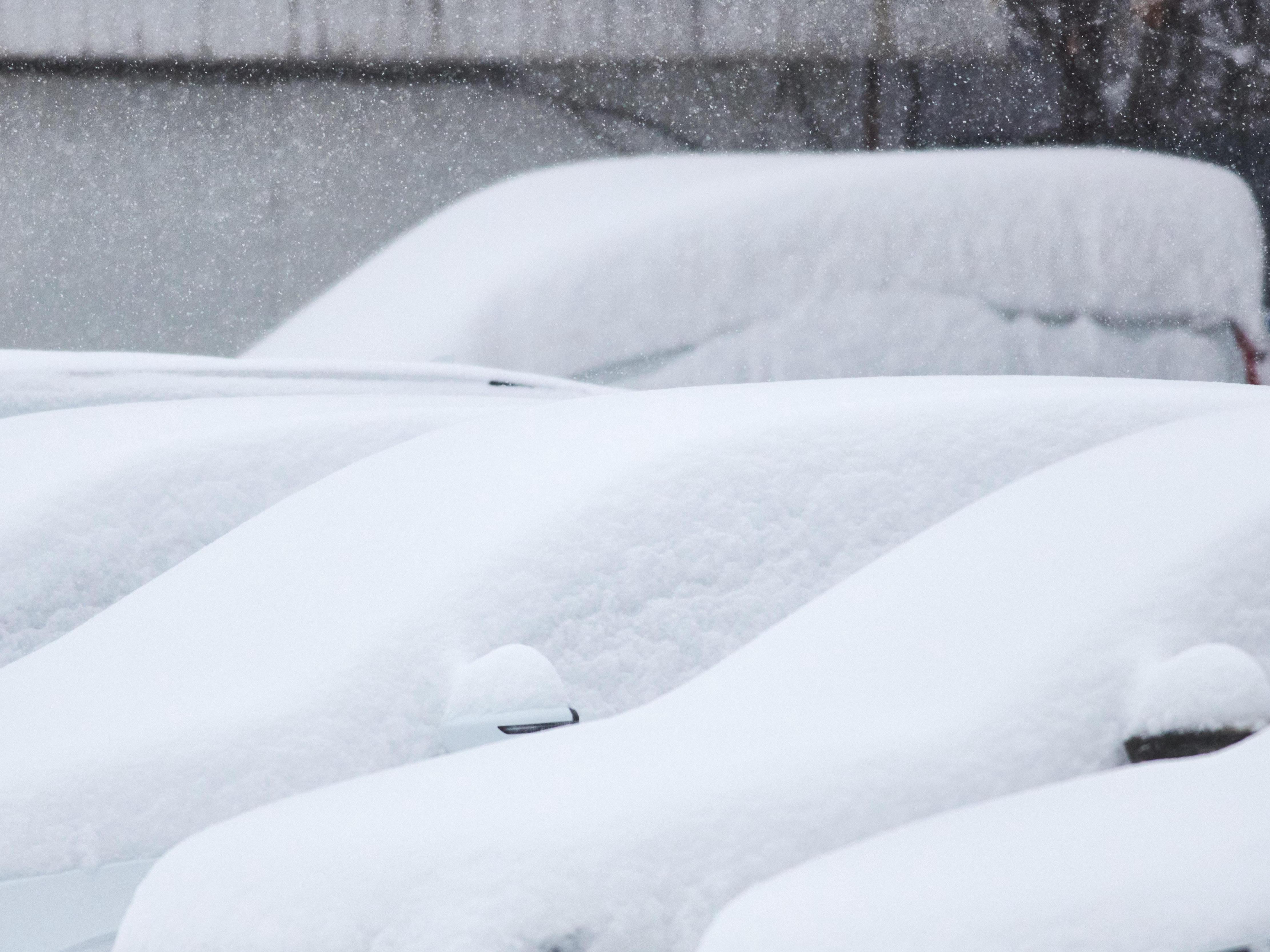 Cars are almost completely covered by the heavy snowfall.