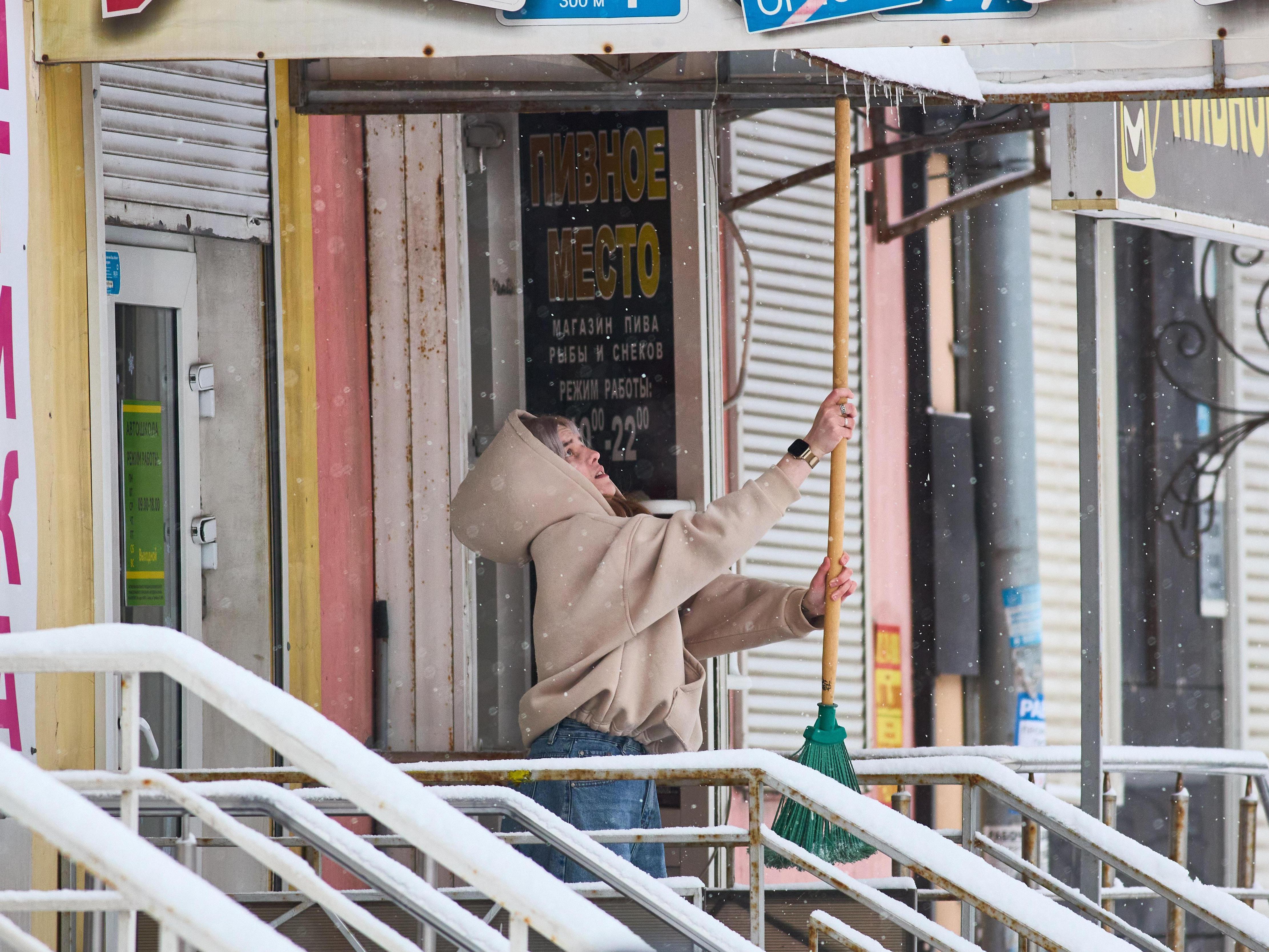 A worker uses a tool to knock snow off the store canopy.