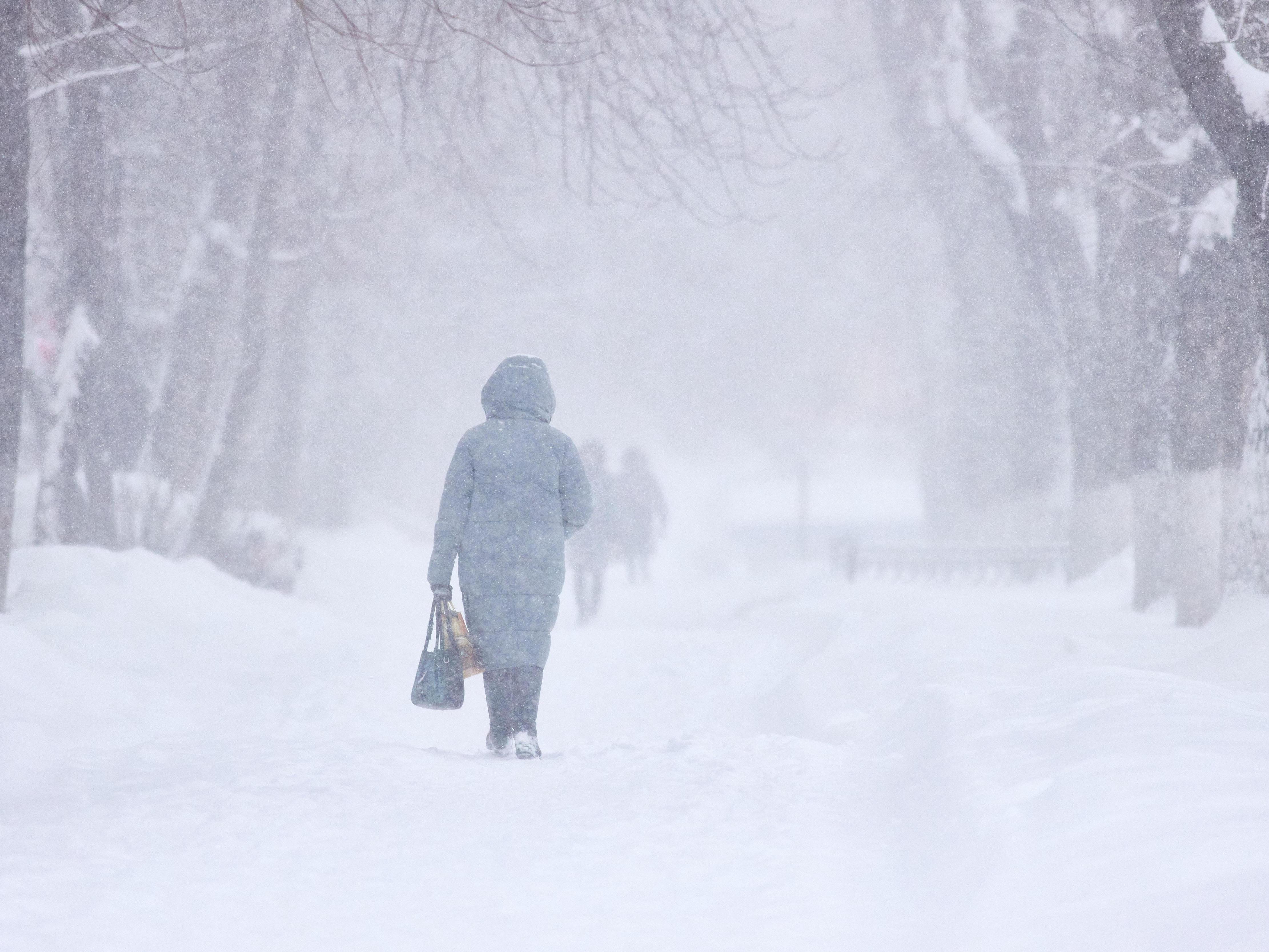 A pedestrian disappears into the thick snowfall after a few steps.