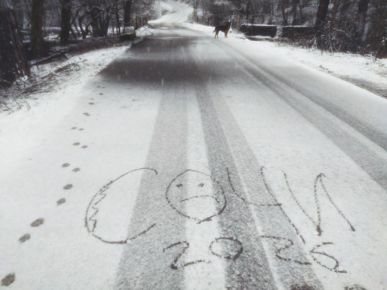 The snowfall has just begun, and soon the road will be gone.