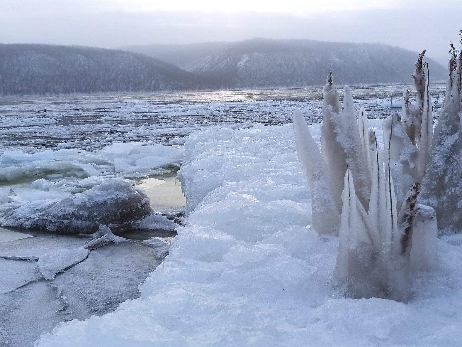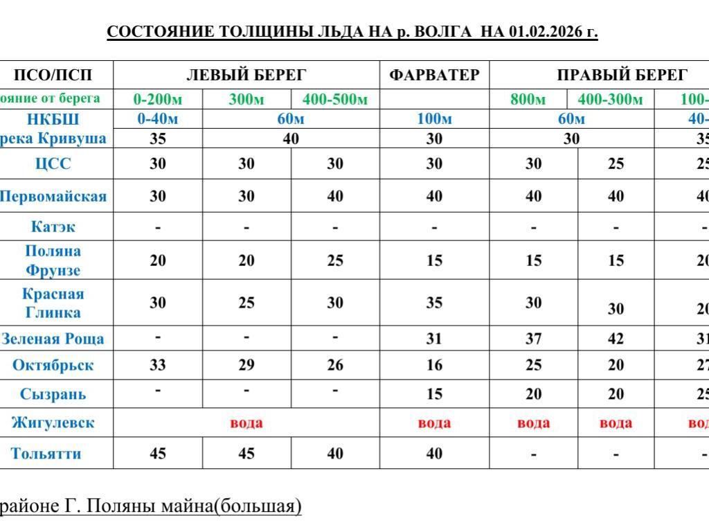 «On the left bank of the Volga, near Tolyatti on the Kuybyshev Reservoir, it is 45 centimeters. 500 meters from shore — 40 centimeters. And near Zhigulyovsk there is no ice field. There is water everywhere. As for Samara, the thinnest ice is at Frunze Polyana. There the ice thickness is only 20 centimeters at the shore and 25 in the fairway. At Gavrilova Polyana there is a large polynya (open water),» the Search and Rescue Service of Samara Oblast reported.