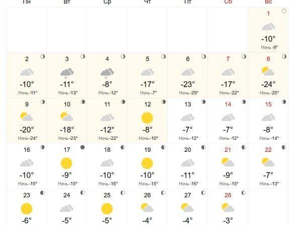 Now let«s try to predict the weather for February in Tyumen using virtual forecasters. According to Yandex.Weather, city residents should not expect severe 30-degree frosts. A portion of cold in the form of −20 °C (-4 °F) will be brought by just a few days in the first ten days of the month. Few snowy days are expected.