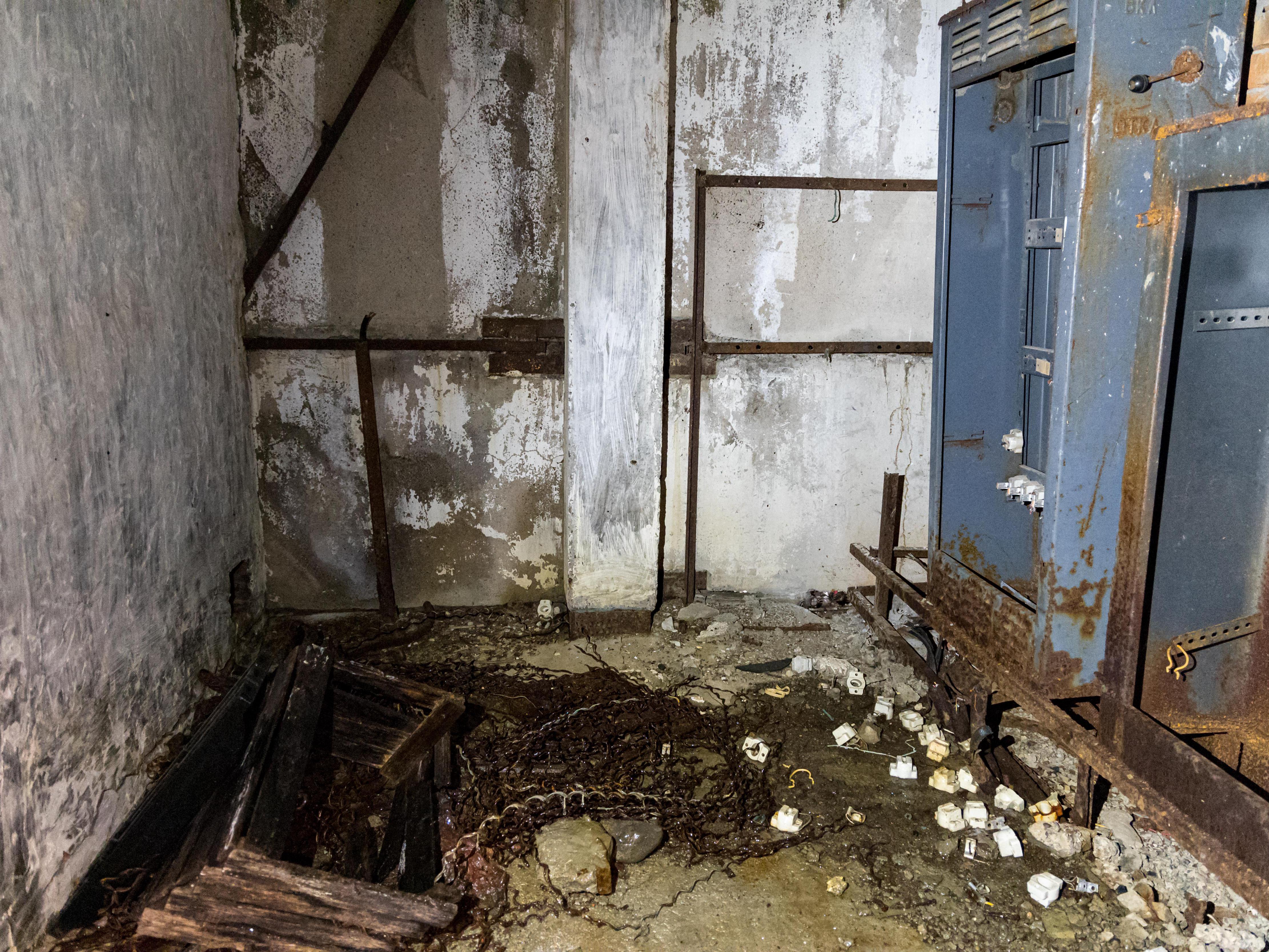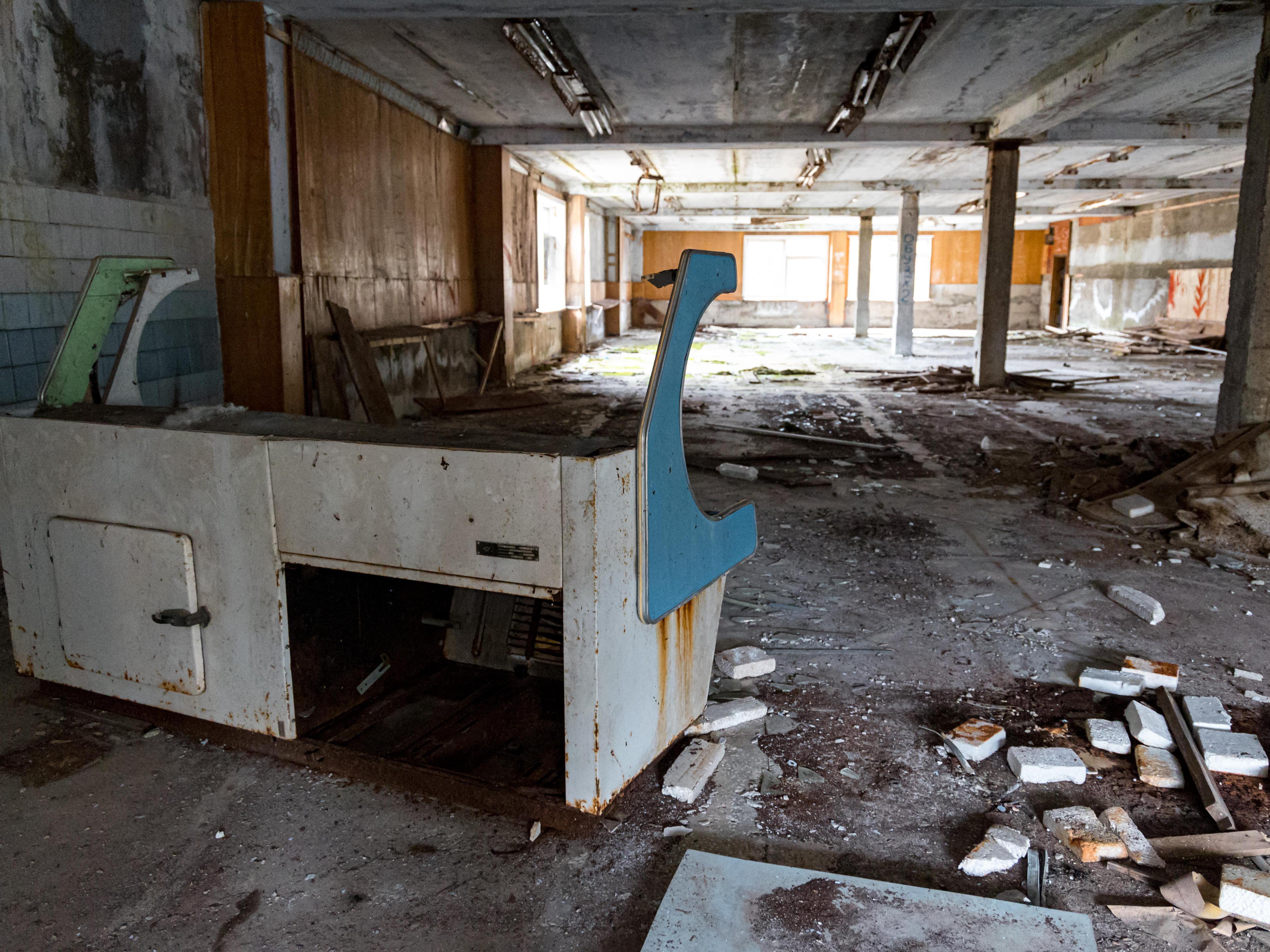 The building, like most here—abandoned. Broken frames, collapsed tiles, remains of a «Birusa» refrigerator and counters.