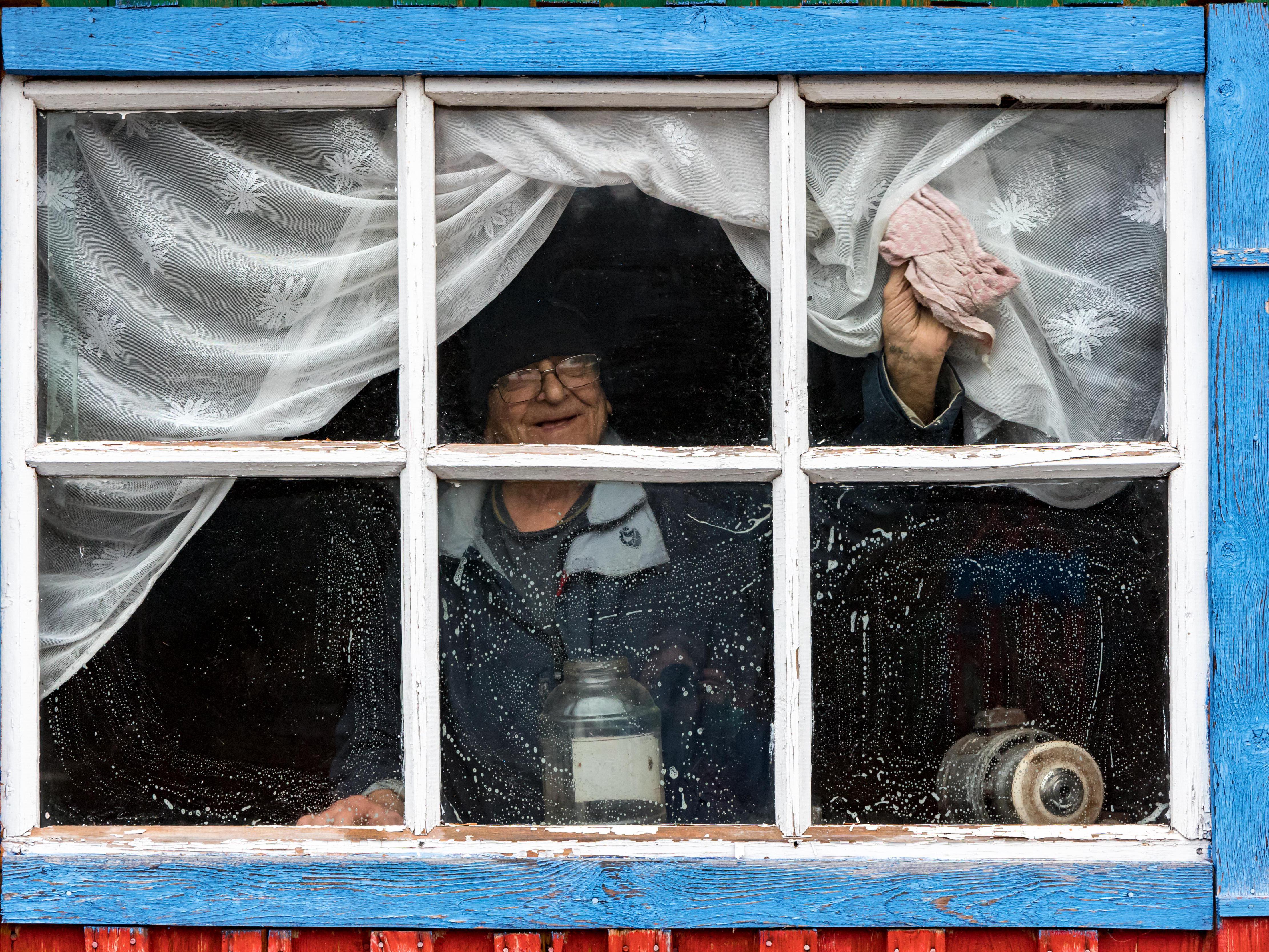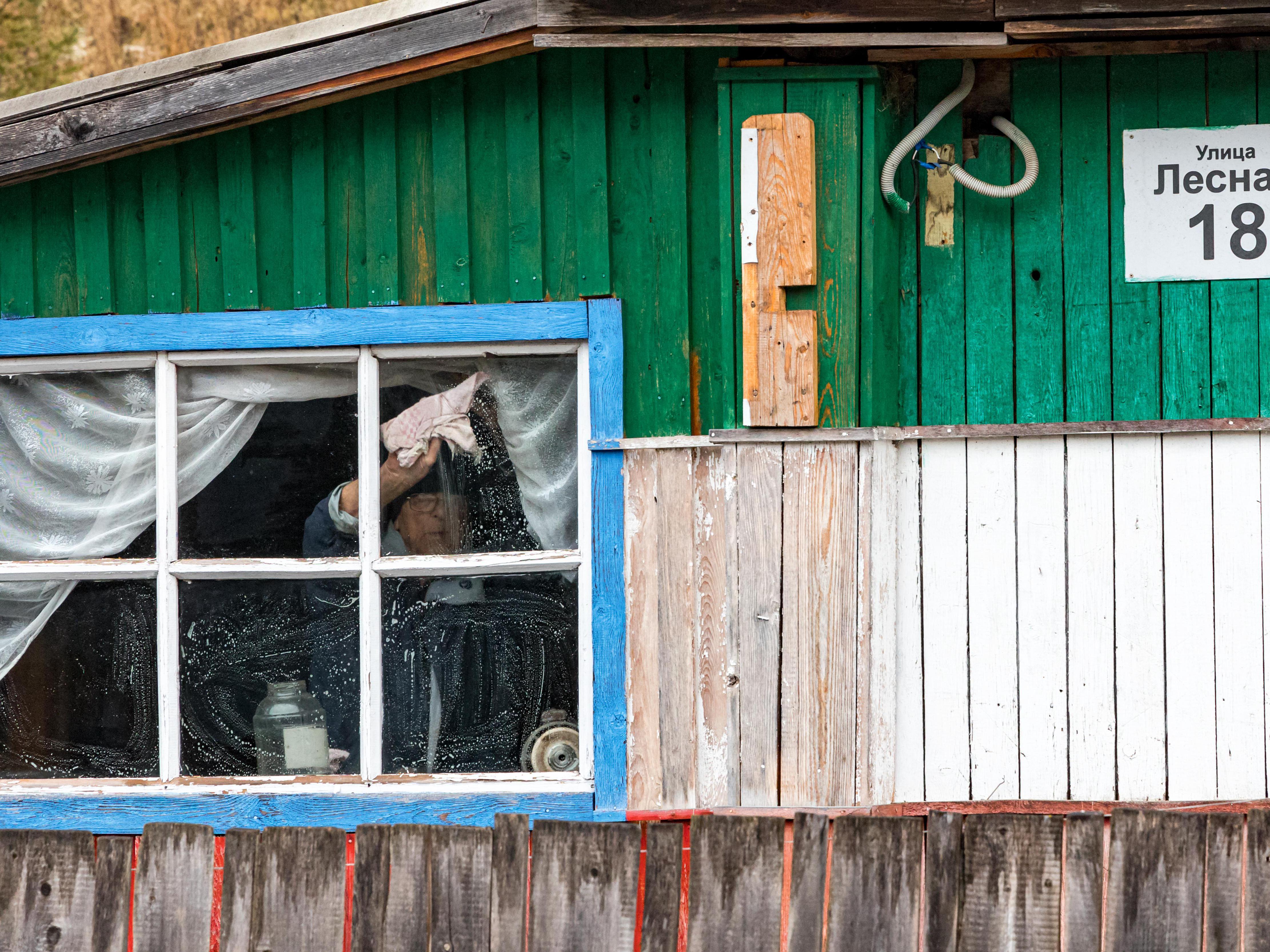 A person appears in the window of a house on the outskirts, rubbing the cloudy pane with a soapy rag, paying no attention to us. We walk along the central and only street here, Lesnaya.