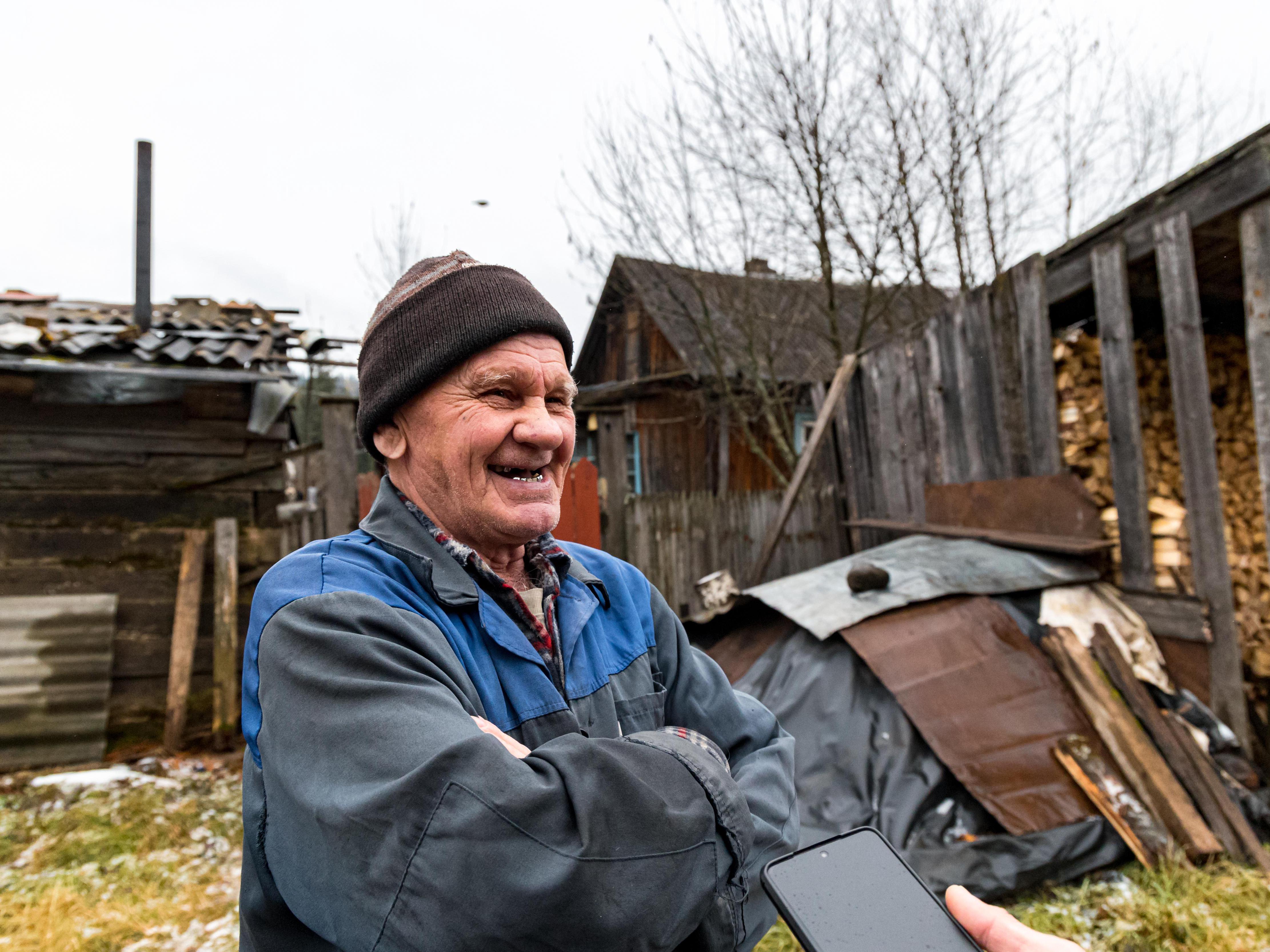Meanwhile, another resident of Verkhnyaya Birusa meets us by his house. Alexander Vasilyev is over 70, he«s been in the village since 2003, worked as a mechanic, felled trees.