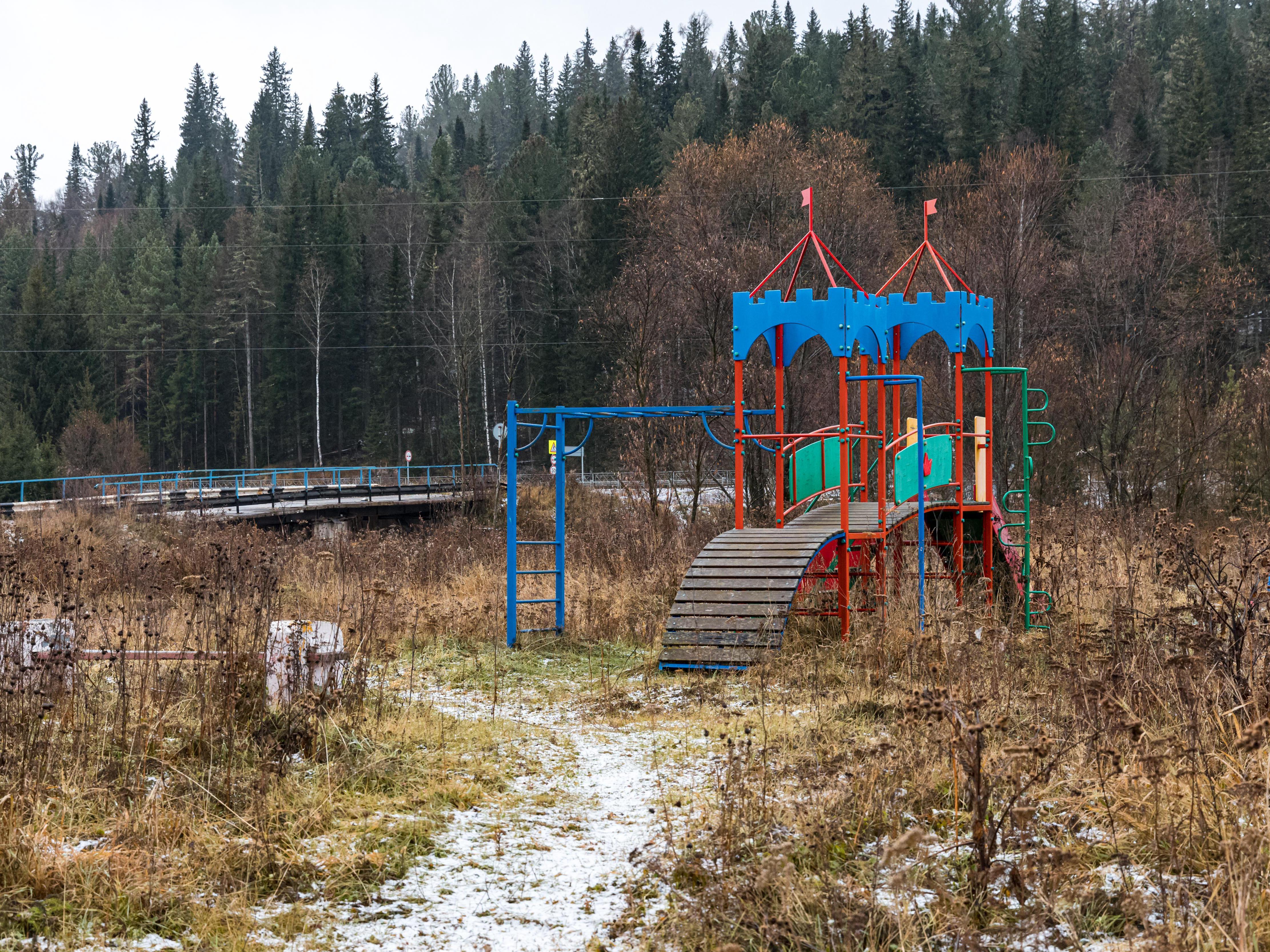 Immediately to the left, in mighty thickets of burdock, a simple children«s playground stands empty. With colorful slides and swings.