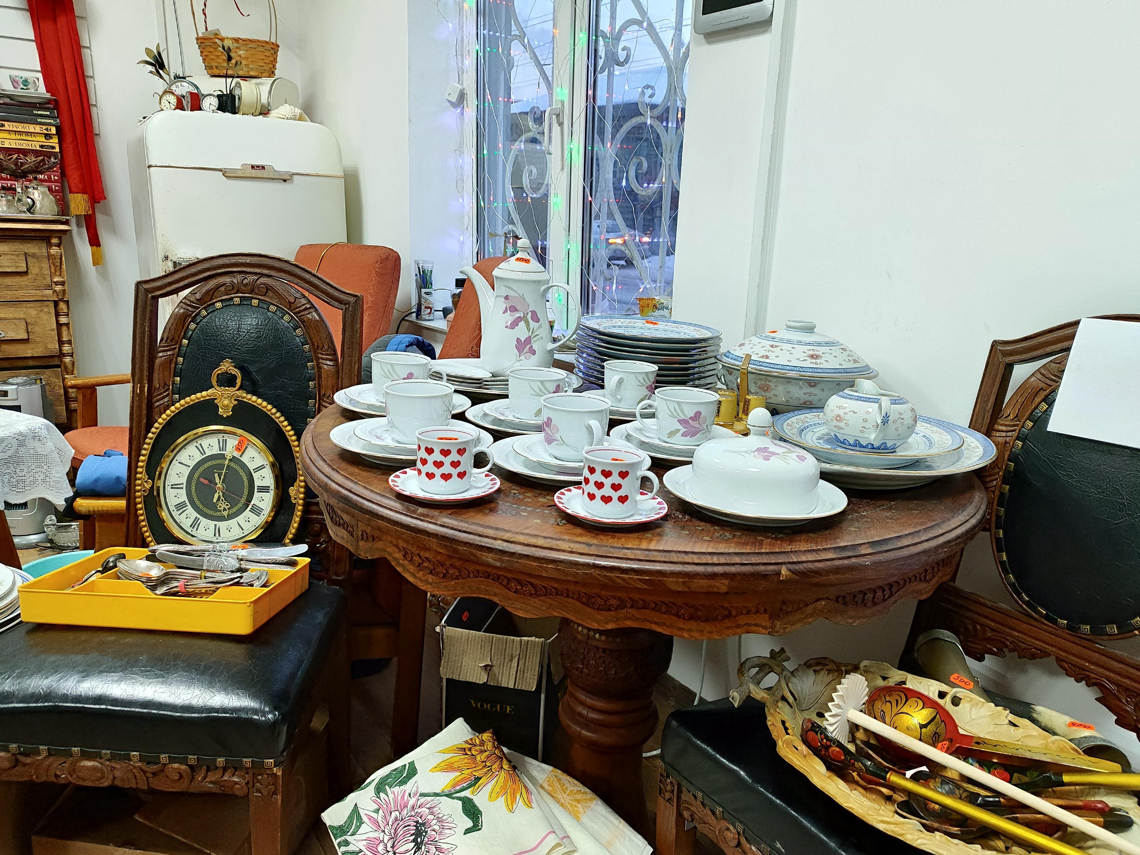 The vintage shop offers items beyond tableware, including books, badges, and trinkets.