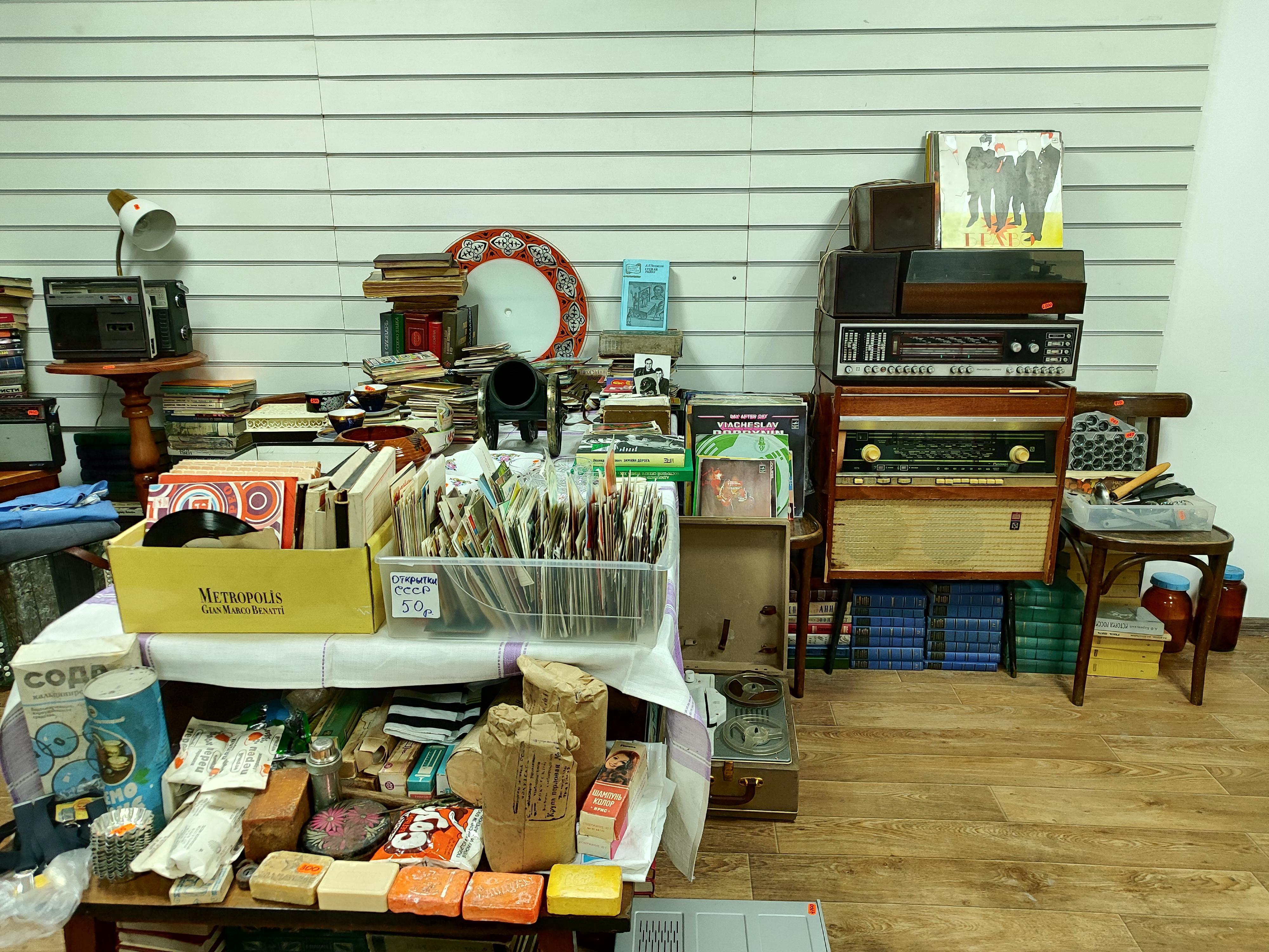 The interior of the vintage shop resembles (fragmentarily so far) the setting of a retro apartment. The similarity is intentional, but not yet perfected, as Alexander does not yet have the necessary set of furniture. For example, porcelain and crystal are displayed on modern shelving rather than in Soviet «stenki» (wall units) as the shop owner would like. However, the shop already has an antique chest of drawers, a bulbous Zil refrigerator, typical Soviet armchairs, and even a Rigonda radiogram.