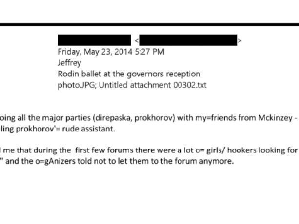 «It looks like we are hosting all the big parties (Deripaska, Prokhorov) with my friends from McKinsey & Company – it»s much better than going alone or bringing Prokhorov«s rude assistant. P.S. My friends told me that at the first few forums there were many girls/prostitutes looking for guys. Eventually it became too much, and the organizers said not to let them in anymore,» the message reads.