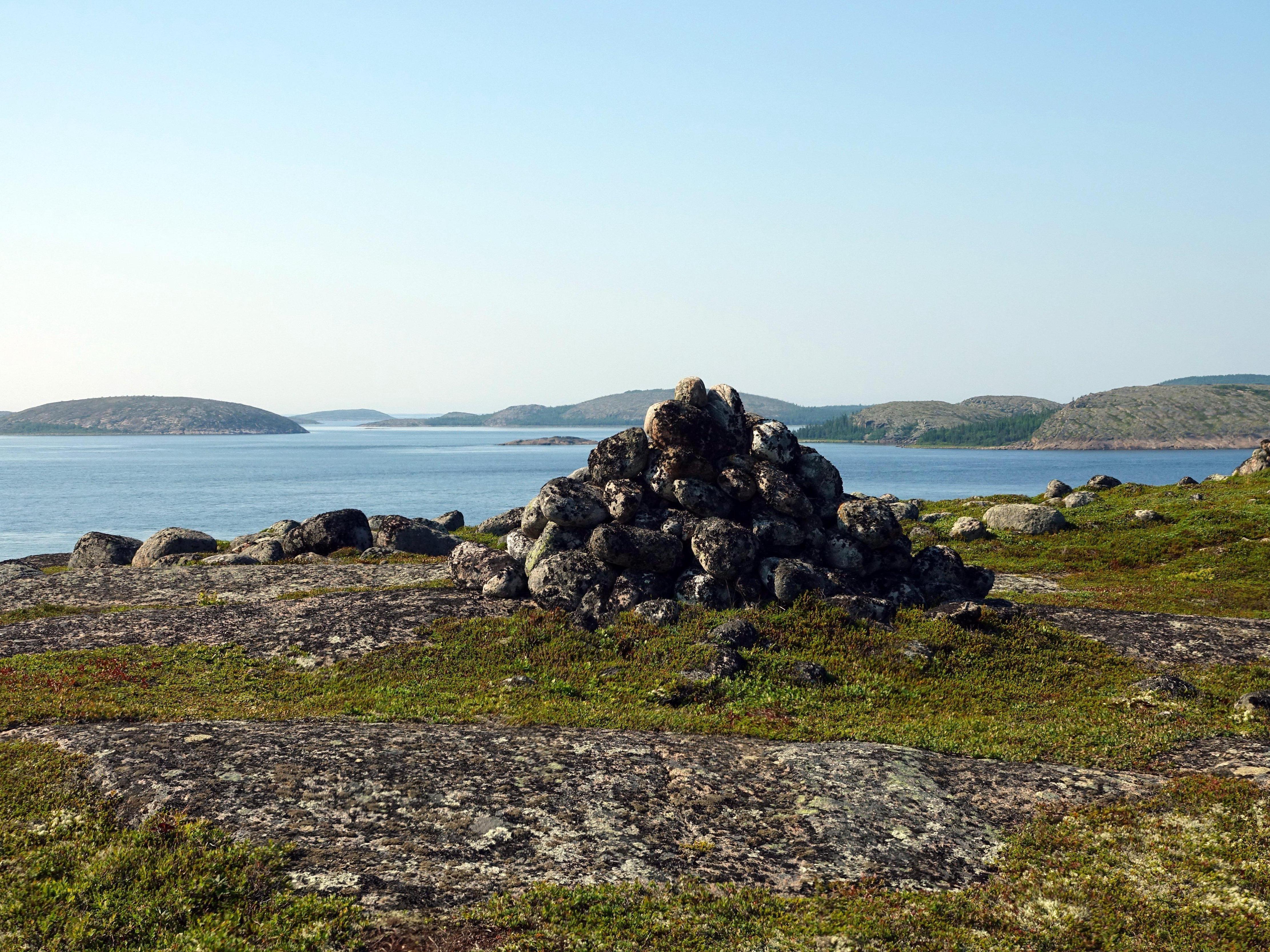 — This place is mysterious, shrouded in secrets, legends, — the traveler says. — The archipelago is located about fifteen kilometers (9 miles) from the mainland and consists of fifteen islands. The name of the archipelago, according to one version, comes from the language of the ancient Sami and means «spruce heads». Numerous ancient artifacts in the form of various man-made stone structures have been discovered on the islands. Many of them are a thousand years old or more. These are seids and labyrinths. Seids are most often a large boulder, one corner of which is raised above the ground and rests on one or two small stones. You can also see a boulder lying on several small stones. There are seids in the form of several flat stones stacked on top of each other. There are also stone pyramids almost as tall as a person. There are several hundred such structures on the islands of the Kuzova archipelago.