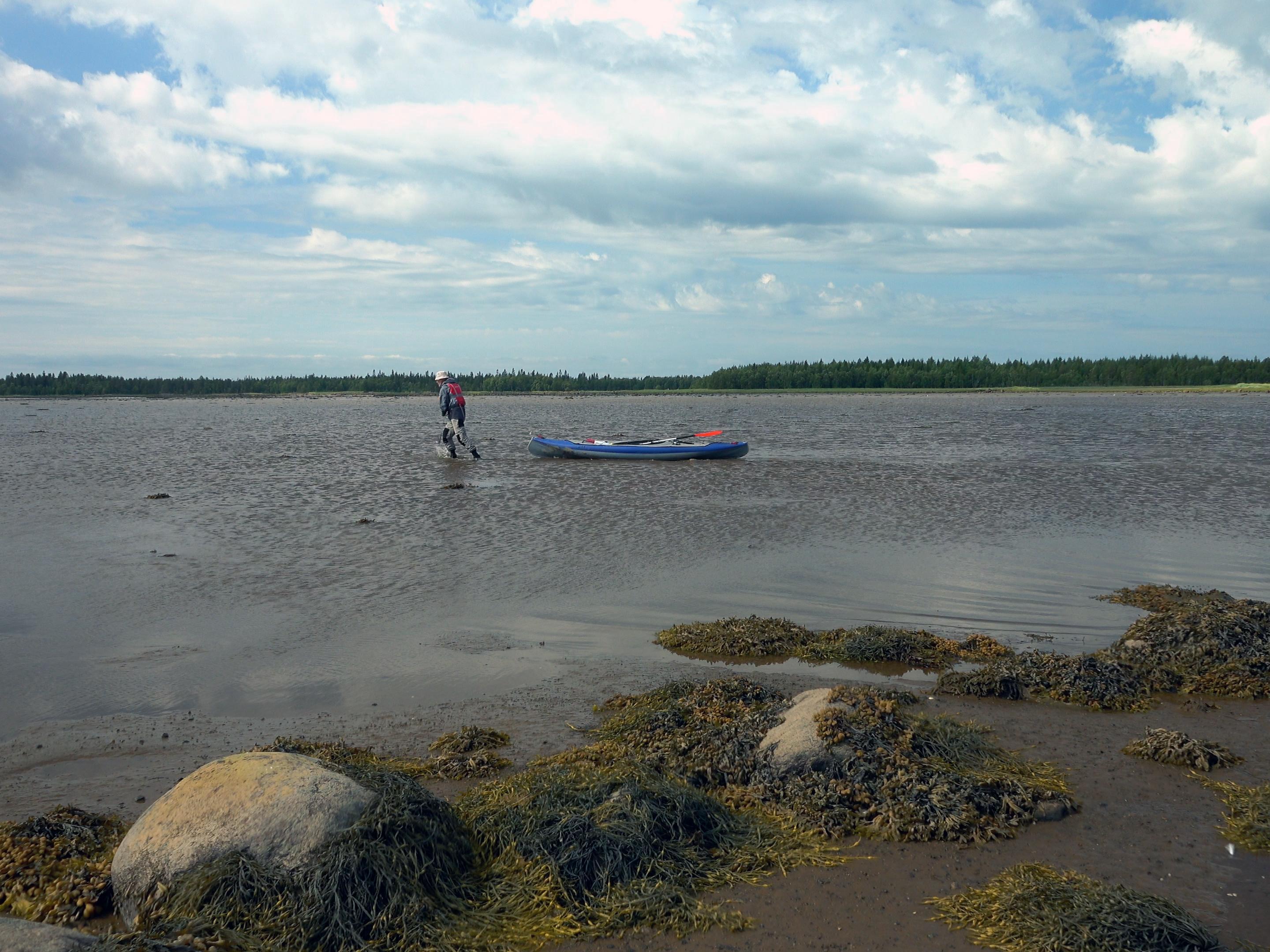 The sea in the area of the Kem skerries is quite shallow. Therefore, at low tide, the water recedes from the shore by tens or even hundreds of meters. Some straits between islands at this time turn into spaces filled with liquid mud. If you hesitate a little — you can get stuck, in the literal sense of the word. Then you have to sweat a lot, dragging your things and kayak over the sticky mud to solid ground, or temporarily become a barge hauler to drag the kayak to the water.