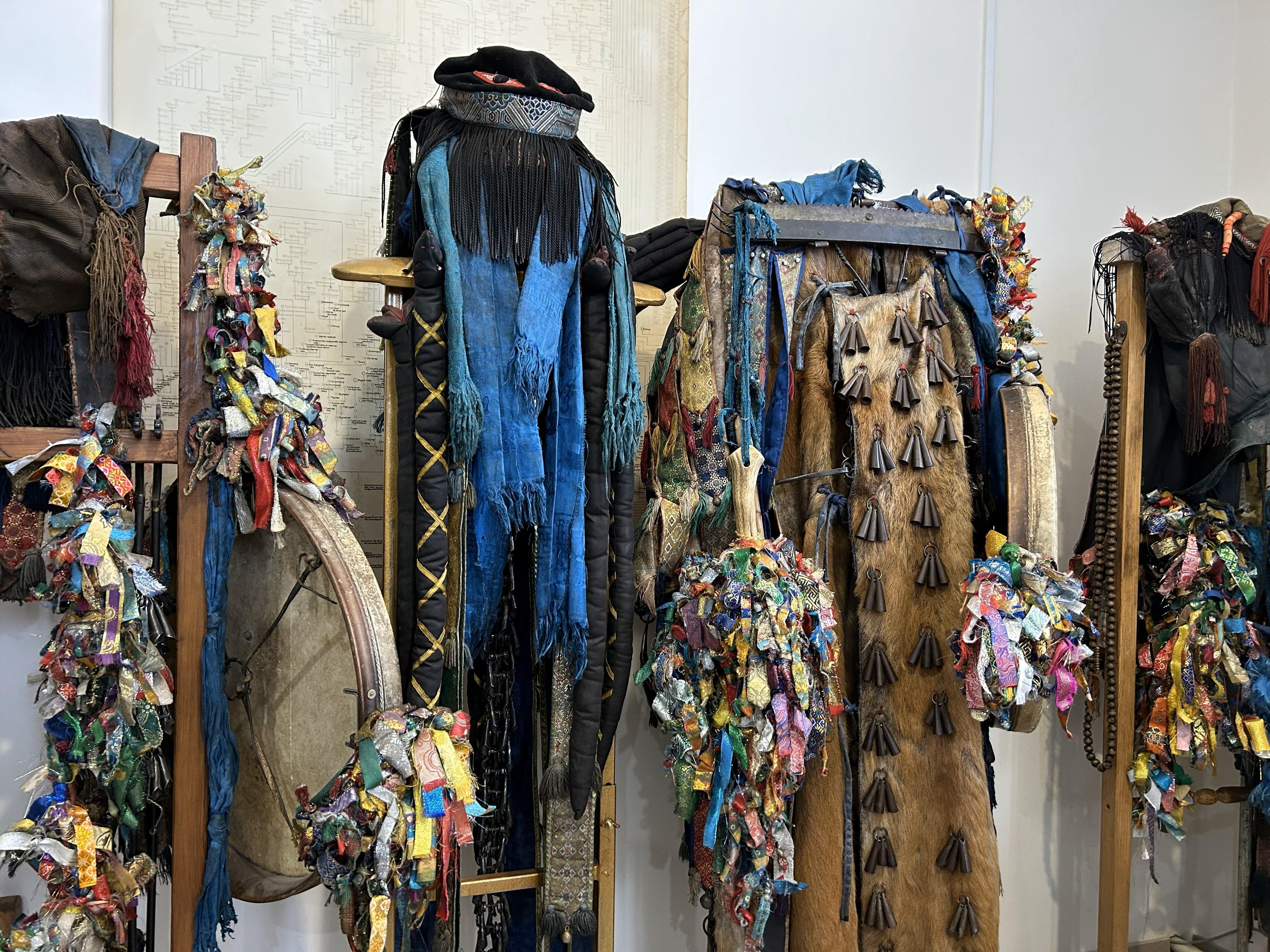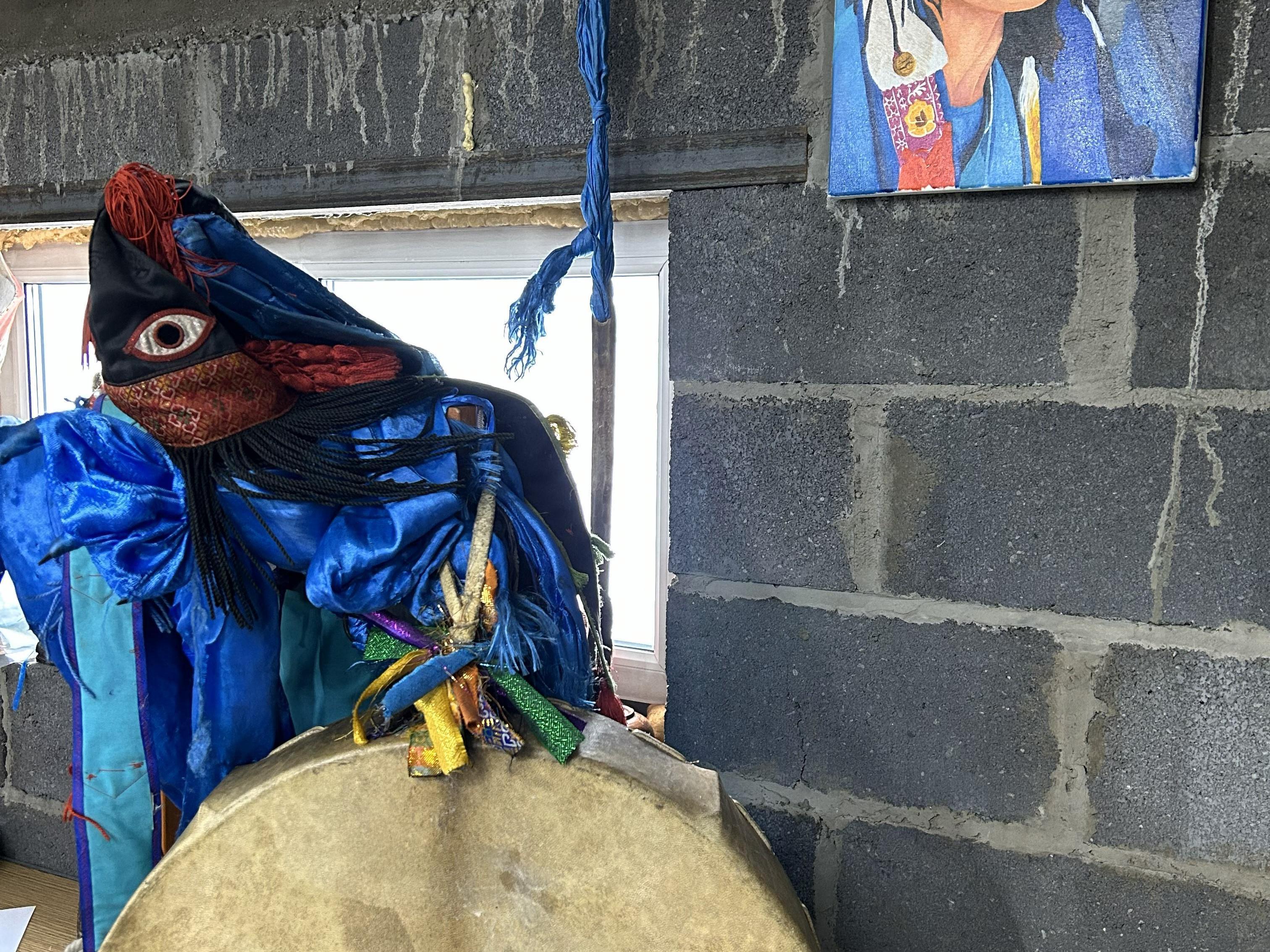We sit in his office. Almost like in a shamanism museum. Offerings, souvenirs, tambourines, paintings, ritual accessories. Next to the wooden throne-chair hang his costumes with masks. Each for its own occasion.