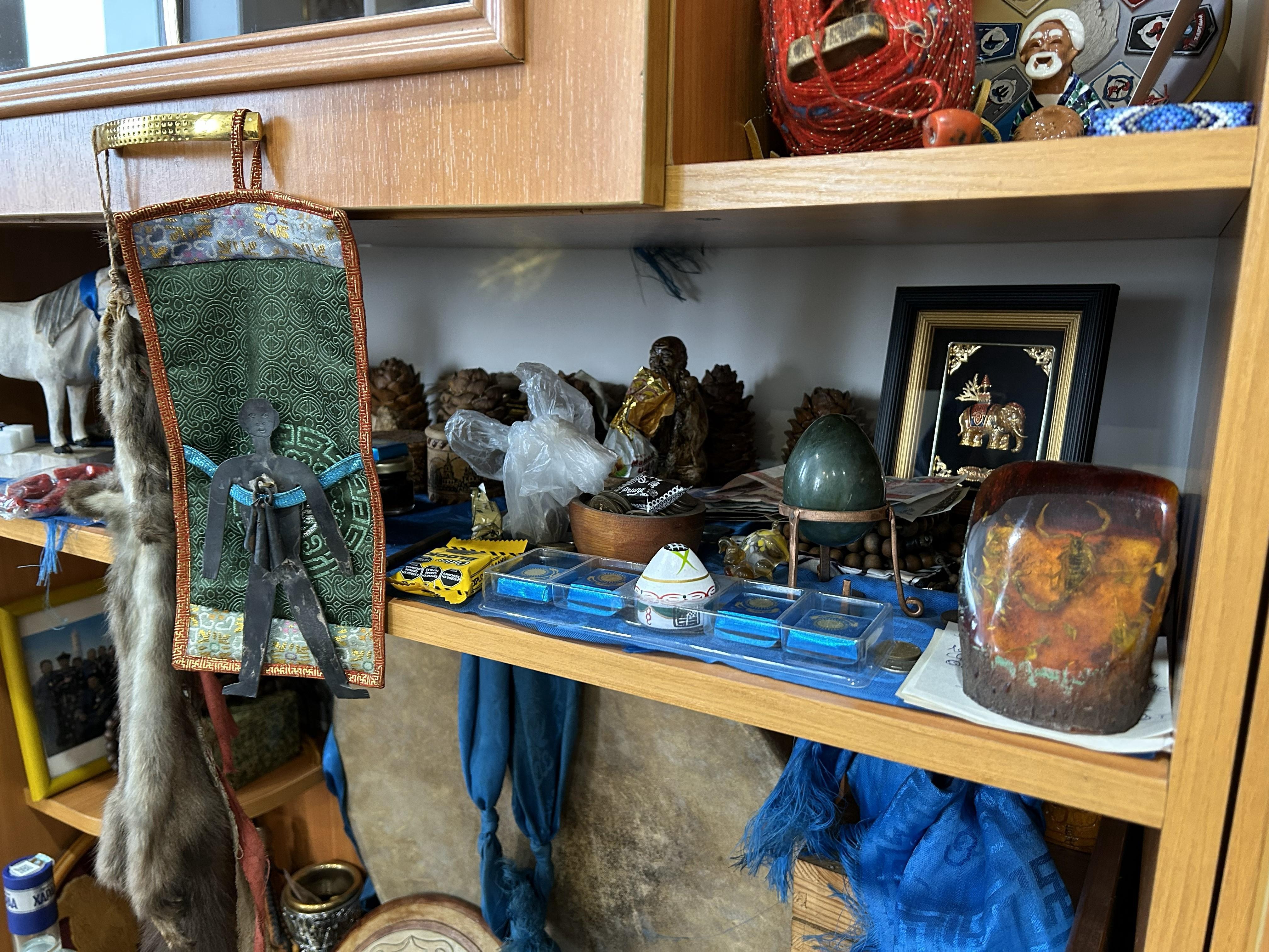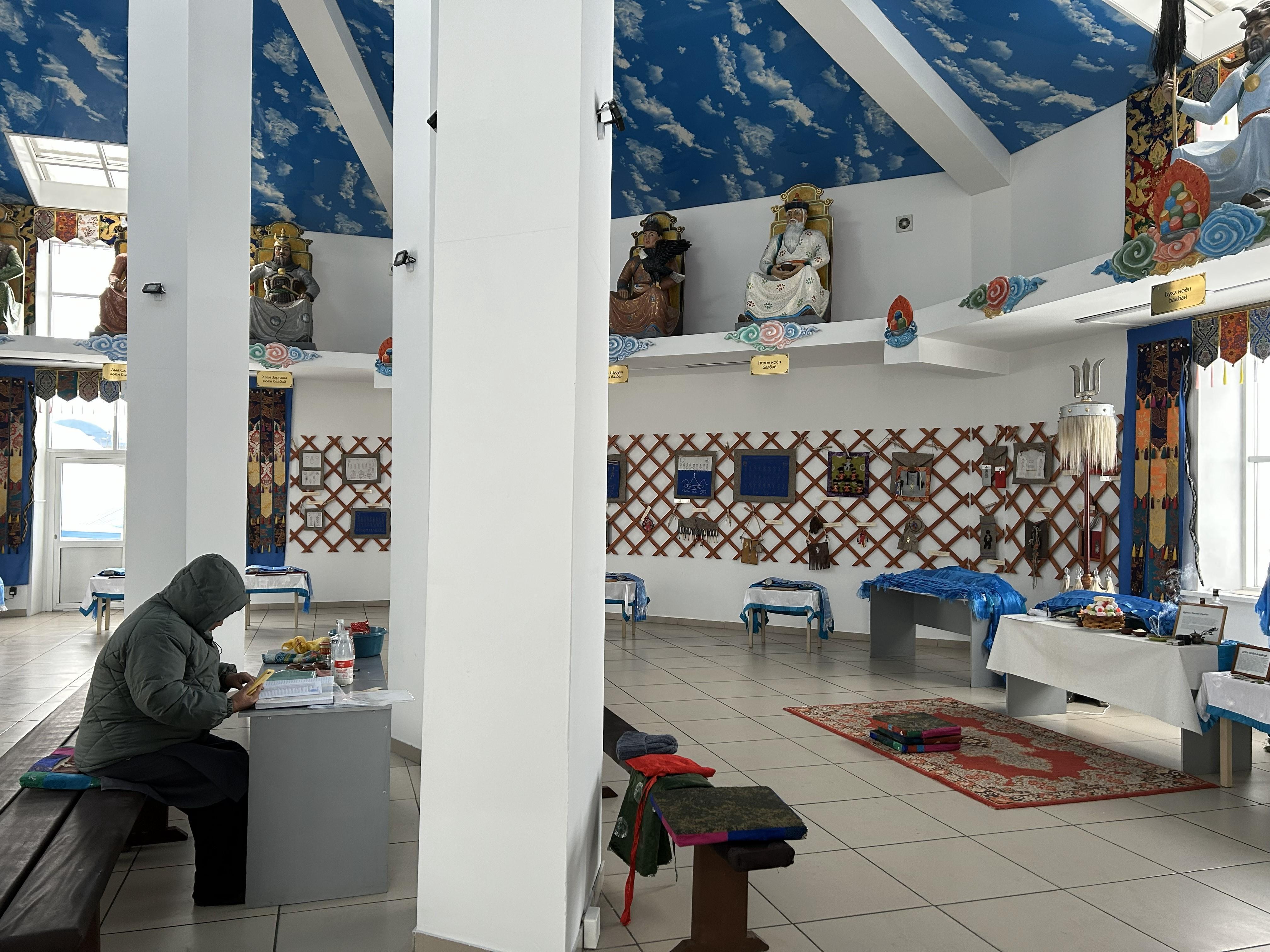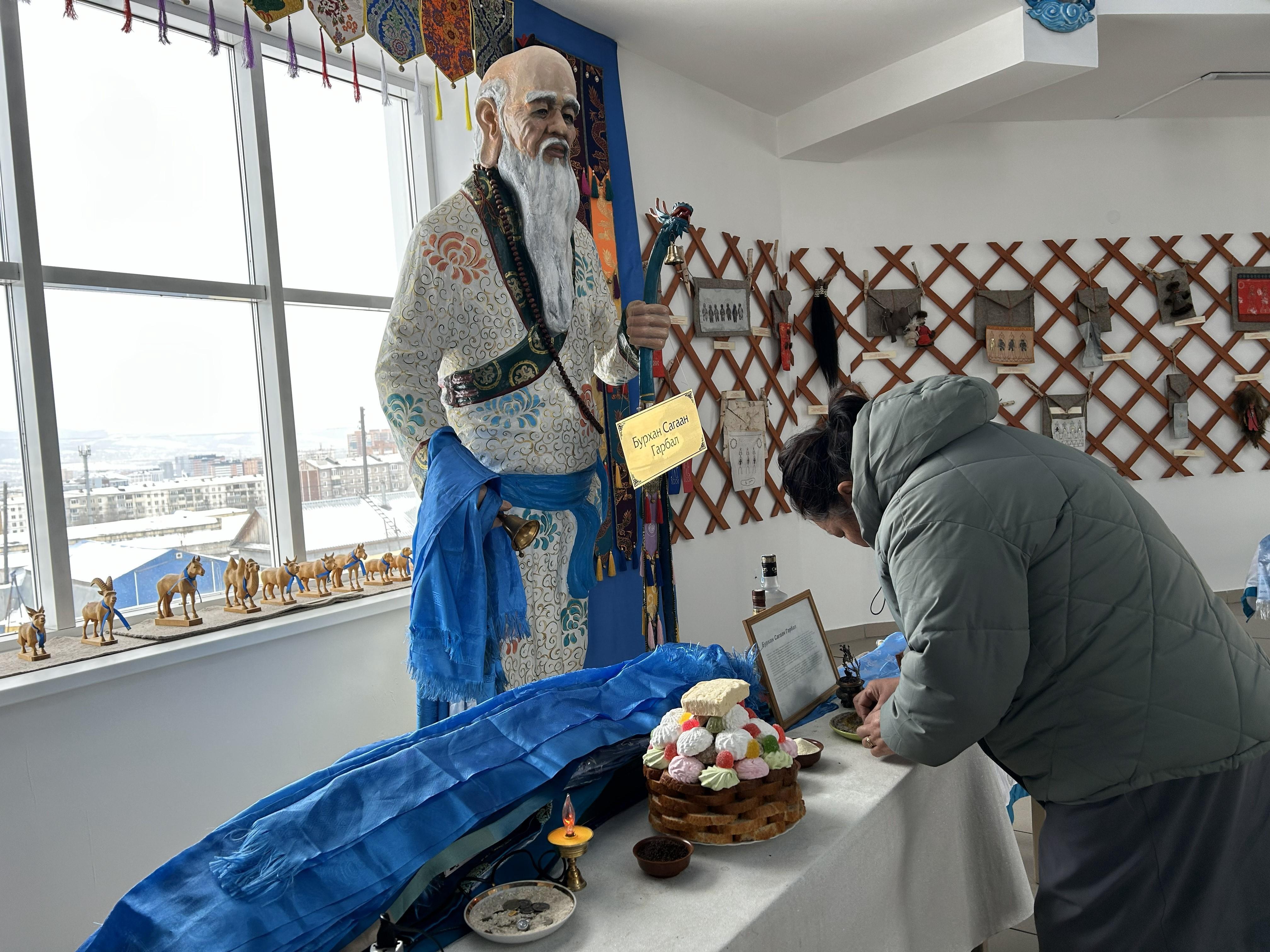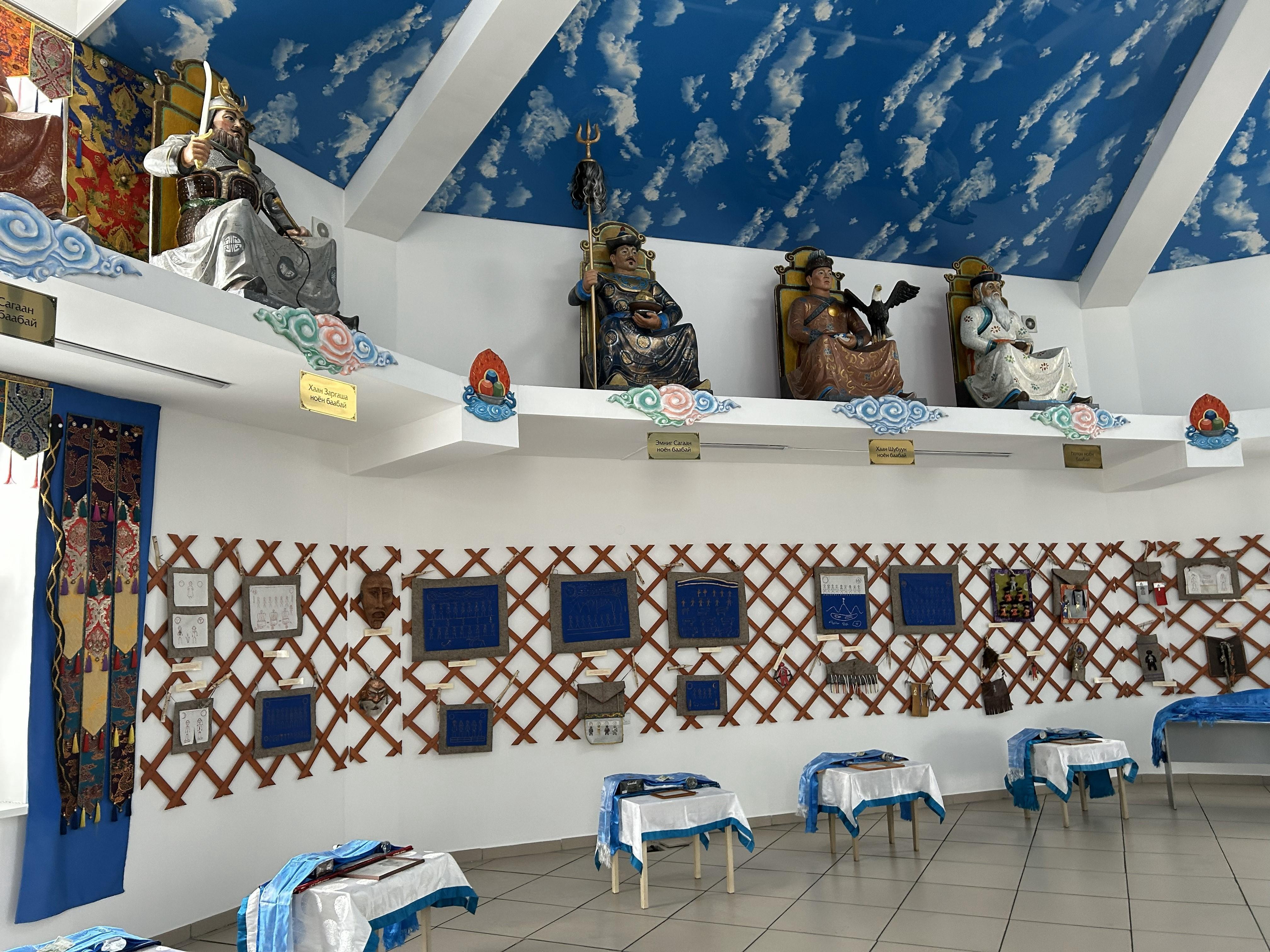 «This is the heavenly palace, to put it simply. The sculptures are dedicated to 13 great deities. Each is responsible for a certain period of life. And also symbolize justice, wealth, wisdom, honesty, strength,» Oksana continues. «And here we have the sulde of Genghis Khan transmitted from China — a symbolic banner, that is, the spirit of Genghis Khan. Only men approach it, and one can even touch it.»