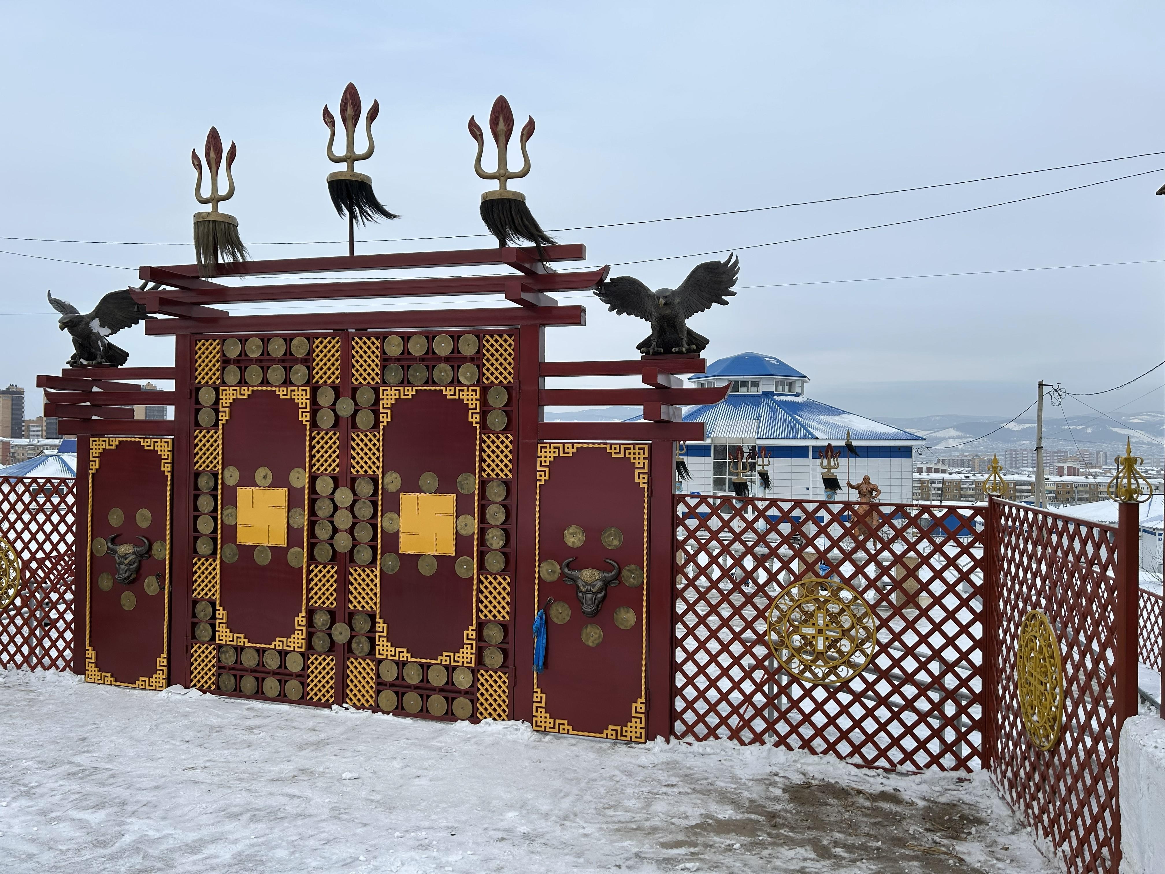 I get off at the large gates of the shamanic religious center «Tengri». Behind them, on a large enclosed territory, is a complex of administrative buildings, service houses, and a temple in the form of a three-story yurt.