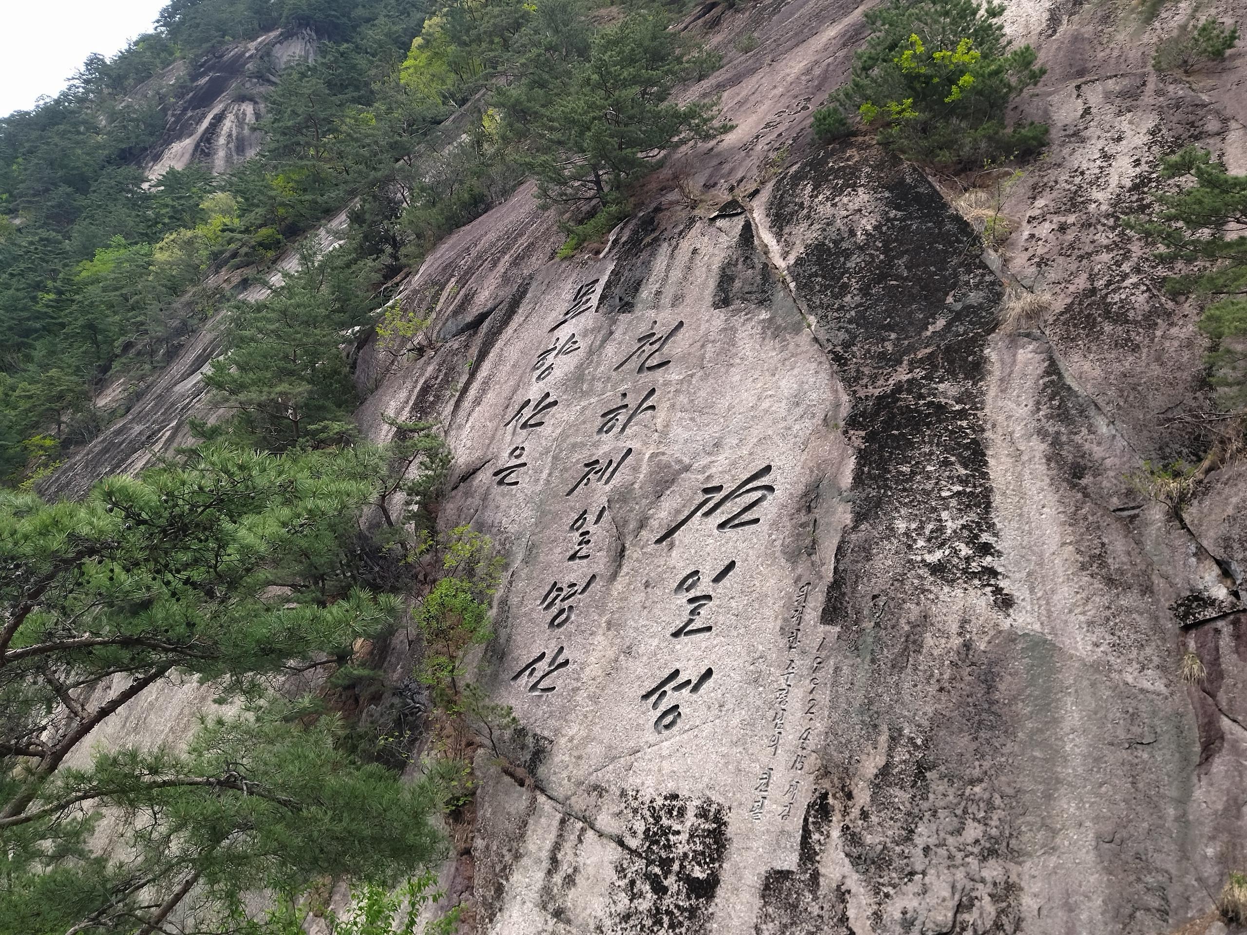 Quotations by former president Kim Il Sung are carved into rock faces.