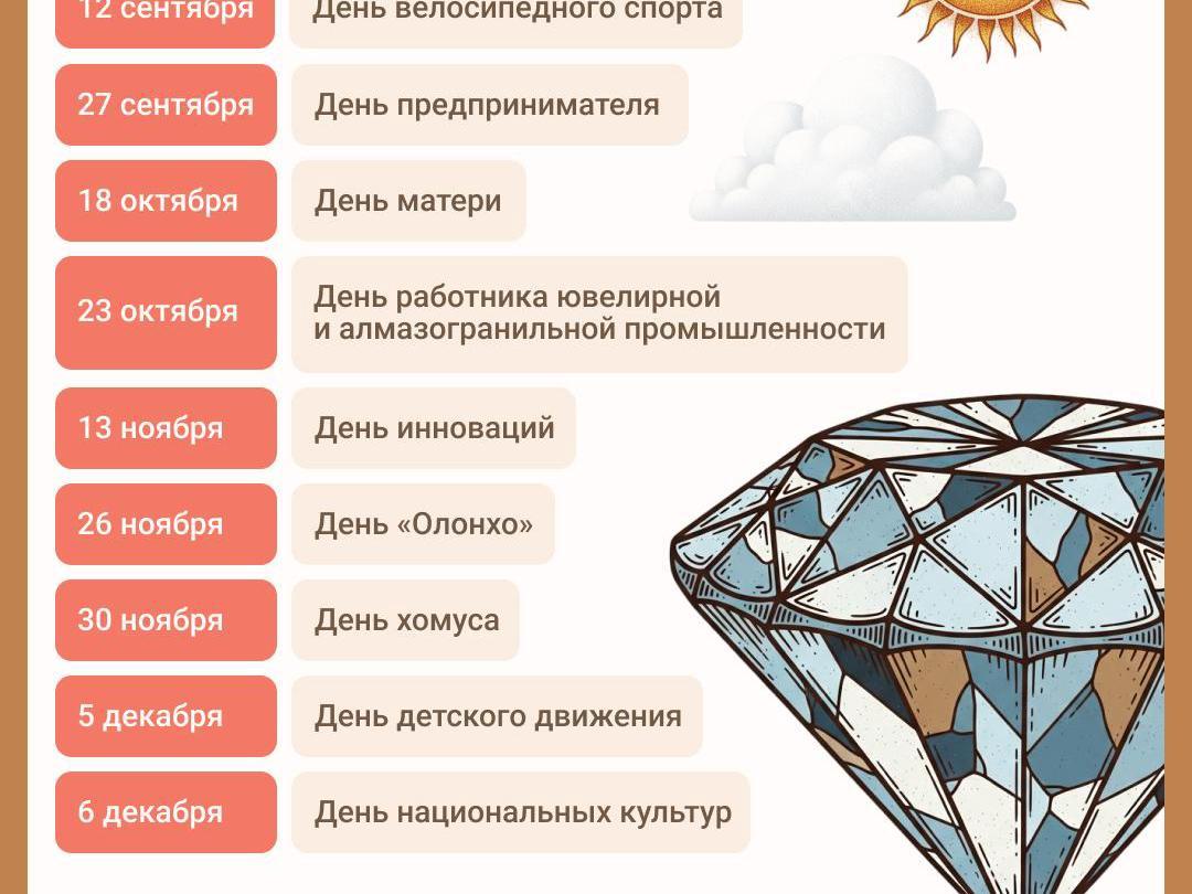 Yakutians also have their own Mother«s Day, which in 2026 falls on 18 October, as it is the third Sunday of October. The mothers» holiday was established by Mikhail Nikolayev in 1993. A few days later — 23 October — workers of the jewelry and diamond polishing industry celebrate their professional holiday. It was established by the second president of the republic, Vyacheslav Shtyrov, in 2010.